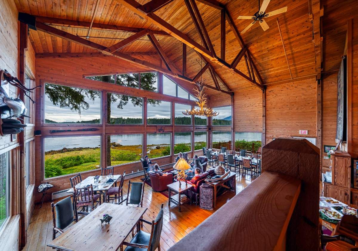 Food at the lodge consists of a full American breakfast prepared to order, hearty lunches, and a hand-served four-course gourmet dinner. The cuisine features the tastes of Alaska such as fresh halibut, king and silver salmon, spotted prawns, and dungeness crab along with a selection of prime meats. Special meals can be prepared for those with special dietary restrictions.