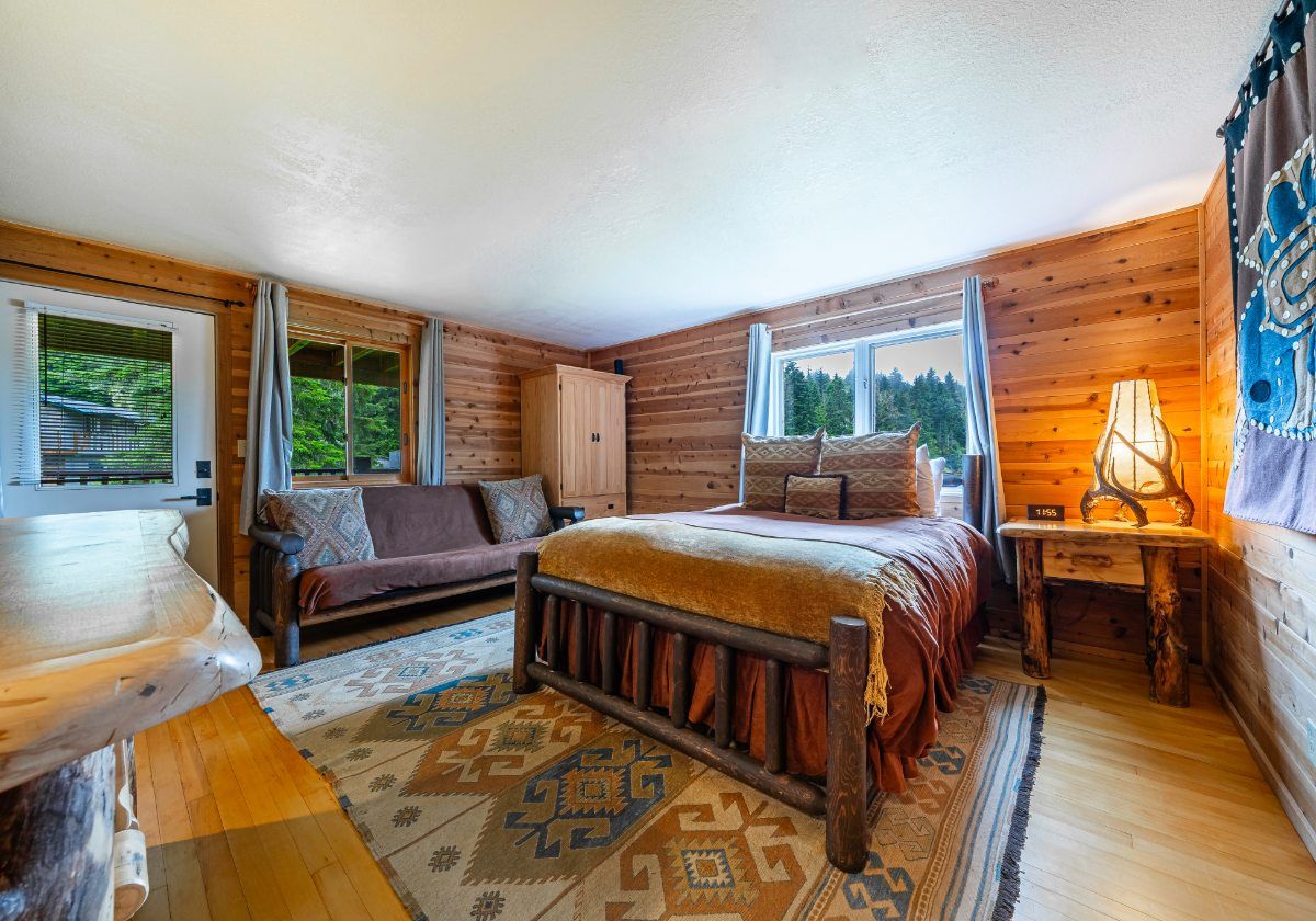 The guest rooms offer views of the inland waters and evening sunsets. The twelve individually designed rooms feature native cedar walls, lodge pole furnishings, full baths with soaking tubs and showers, handcrafted rugs, and luxury bedding.