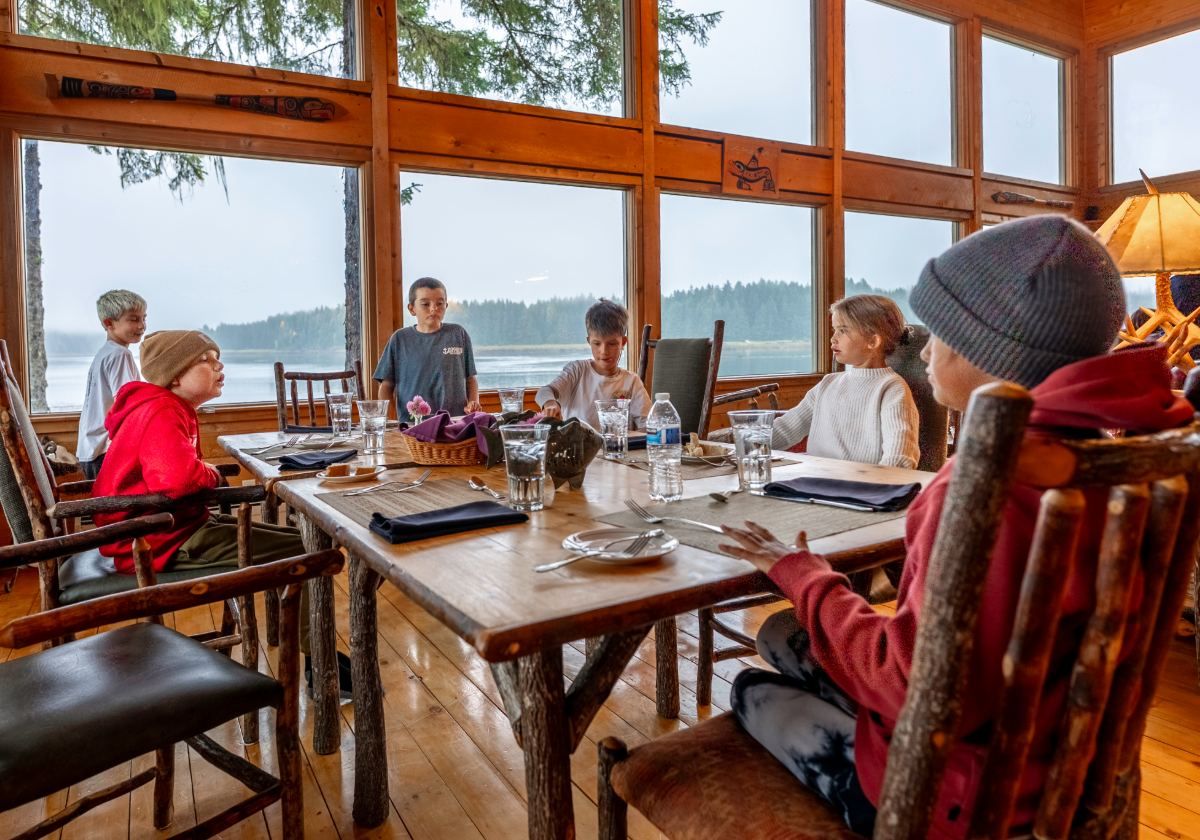 Food at the lodge consists of a full American breakfast prepared to order, hearty lunches, and a hand-served four-course gourmet dinner. The cuisine features the tastes of Alaska such as fresh halibut, king and silver salmon, spotted prawns, and dungeness crab along with a selection of prime meats. Special meals can be prepared for those with special dietary restrictions.
